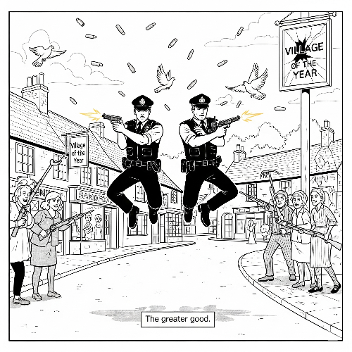 - 슬로우 모션, 폭발, 쌍권총 사격, 카메라 워킹 등 전형적 액션 연출을 영국 시골에 적용해 웃음을 유발. - 액션영화 클리셰 패러디