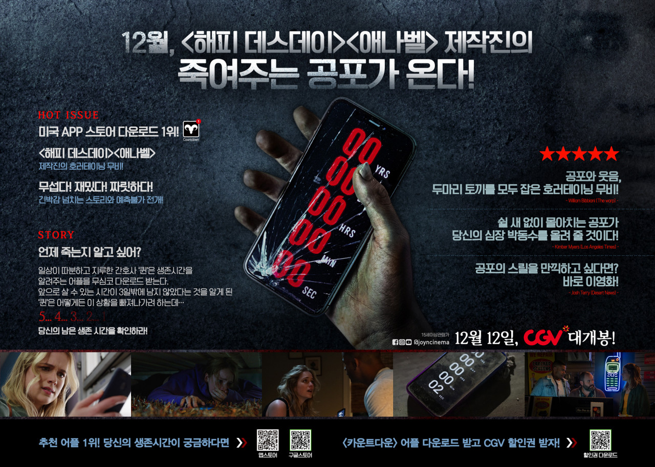 영화상 ‘Countdown’은 사용자의 죽는 순간을 정확히 예고하는 저주 앱의 명칭이자, 곧 죽음을 향해 달려가는 현대인의 불안과 공포, 잔혹한 운명(데스클락)의 메타포입니다.
