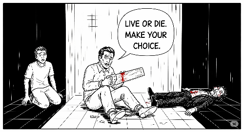 기: 낯선 지하 화장실에서 아담과 고든이 발목이 묶인 채 눈을 뜹니다. 방에는 시체가 하나 놓여 있고, 두 사람은 낯선 서로와 게임의 룰을 듣게 됩니다. “8시간 안에 아담을 죽이지 않으면 가족이 죽는다.”