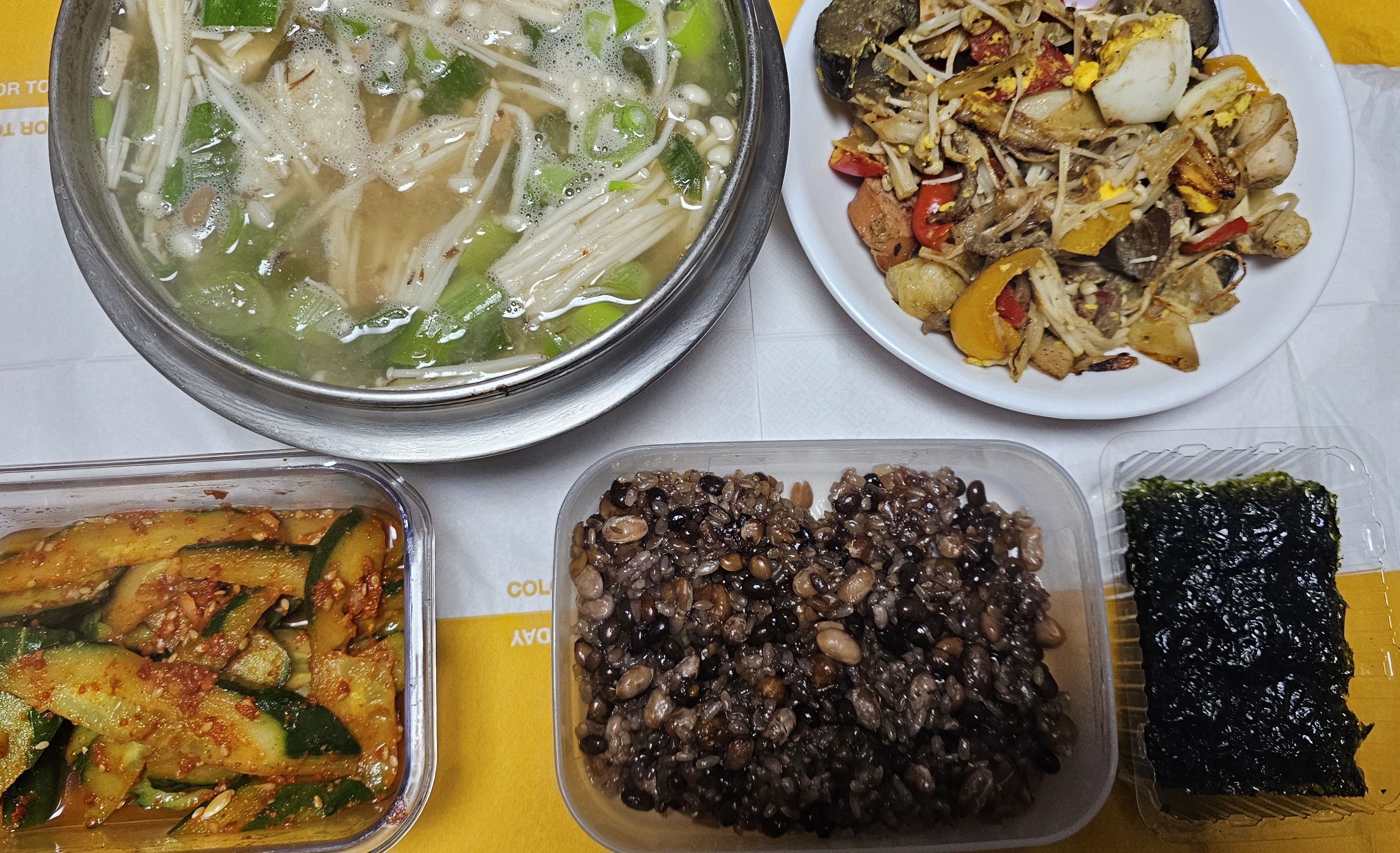 - 오후 4시 48분 : 잡곡밥, 된장찌개, 오이김치, 소시지 야채볶음, 파래김